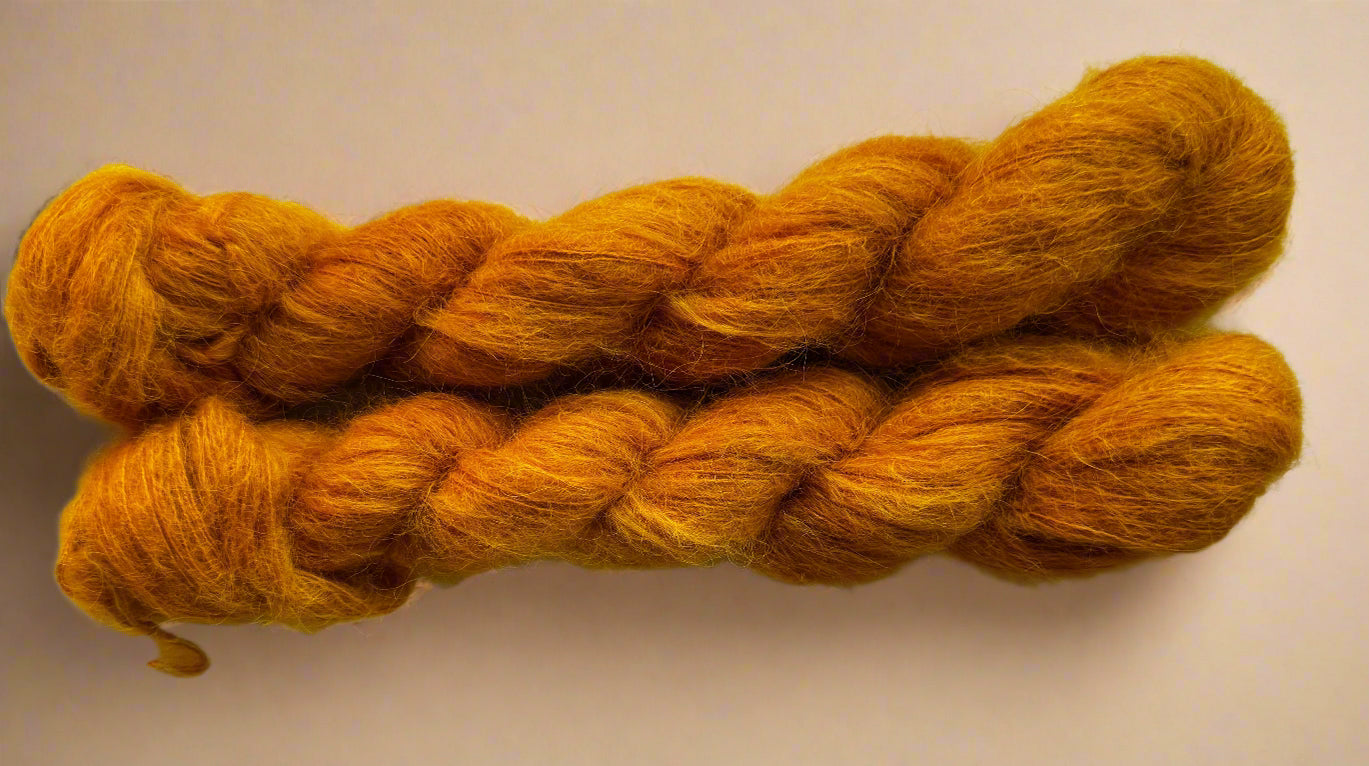 Super soft and fluffy lace weight yarn. Every hank is hand dyed and contains variations in tone. Pictures may not contain all differences in color, so please be aware when ordering your hank may be slightly different from what is pictured.